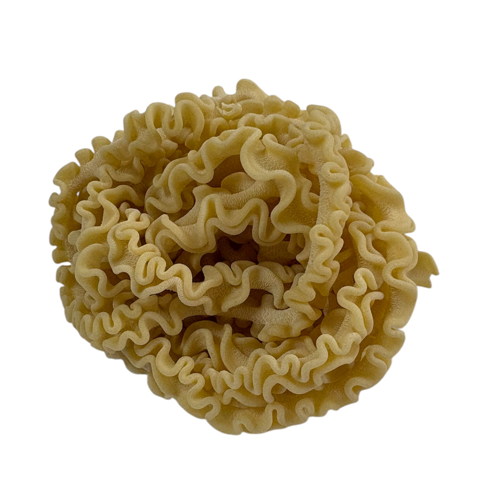 Long, flat ribbon-like with ruffled edges home style pasta with Italian semolina and white flour.